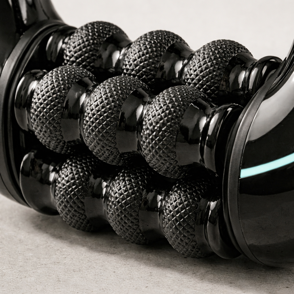 The textured rollers are designed to grip and glide at the same time, delivering a more targeted deep-tissue massage feel than flat, smooth rollers. They help work through tension more evenly, reach tight areas with better control, and support a more effective recovery experience.