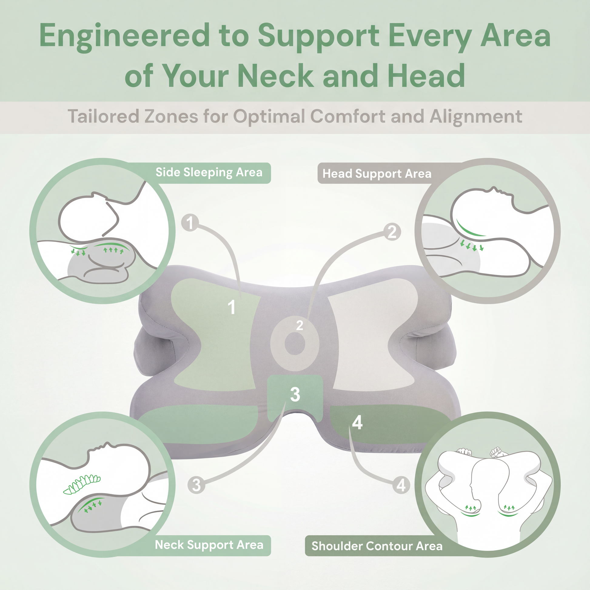 The ergonomic design is intended to reduce pressure points and support proper alignment, which many users find helps reduce neck stiffness and improve overall sleep comfort.